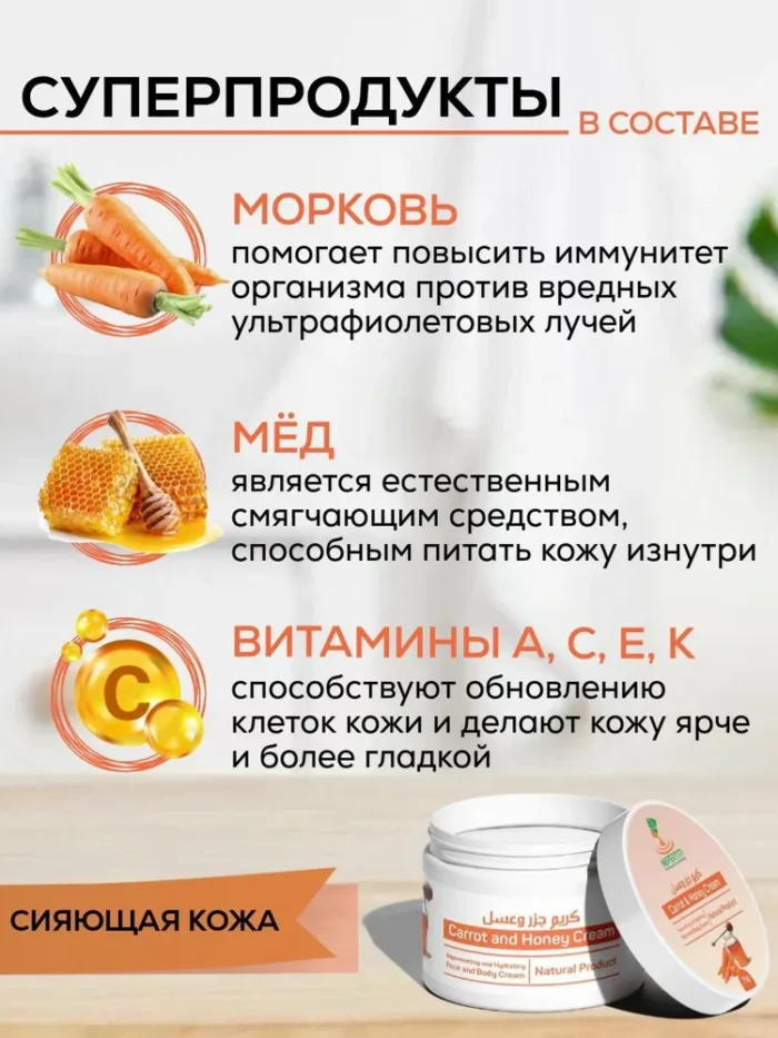 Бета-каротин из моркови помогает повысить иммунитет организма против вредных ультрафиолетовых лучей, помогая защитить кожу от повреждений, вызванных чрезмерным воздействием, таких как пигментация, связанная с солнцем, рак, солнечные ожоги и старение. Кроме того, он восполняет и восстанавливает кожу после пребывания на солнце, а мощные антиоксиданты защищают и устраняют существующие повреждения, эффективно восстанавливая ткани кожи. Мед обеспечивает глубокое питание и уменьшает воспаление на коже. Мощное сочетание, когда речь идет о защите и уходе за нашей кожей во время и после пребывания на солнце.