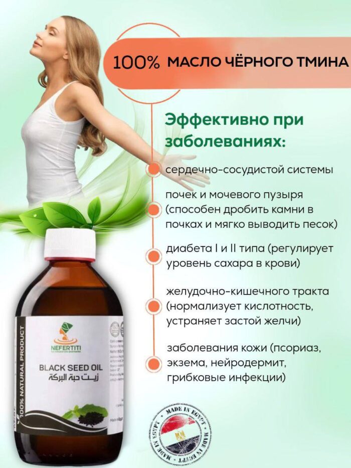 Натуральное масло черного тмина является самым сильным природным средством для снижения уровня холестерина в крови. Оно усиливает мужскую сексуальную функцию, применяется при проблемах с зачатием и предотвращает дисфункцию предстательной железы. Это масло обладает возможностью дробить камни в почках и мягко выводить песок из мочевого пузыря. Масло черного тмина также восстанавливает иммунную систему и применяется при таких заболеваниях как: синусит, сухой кашель, астма, астматический бронхит, простуда, тонзиллит и т. д. Особенно показано людям с повышенным артериальным давлением.