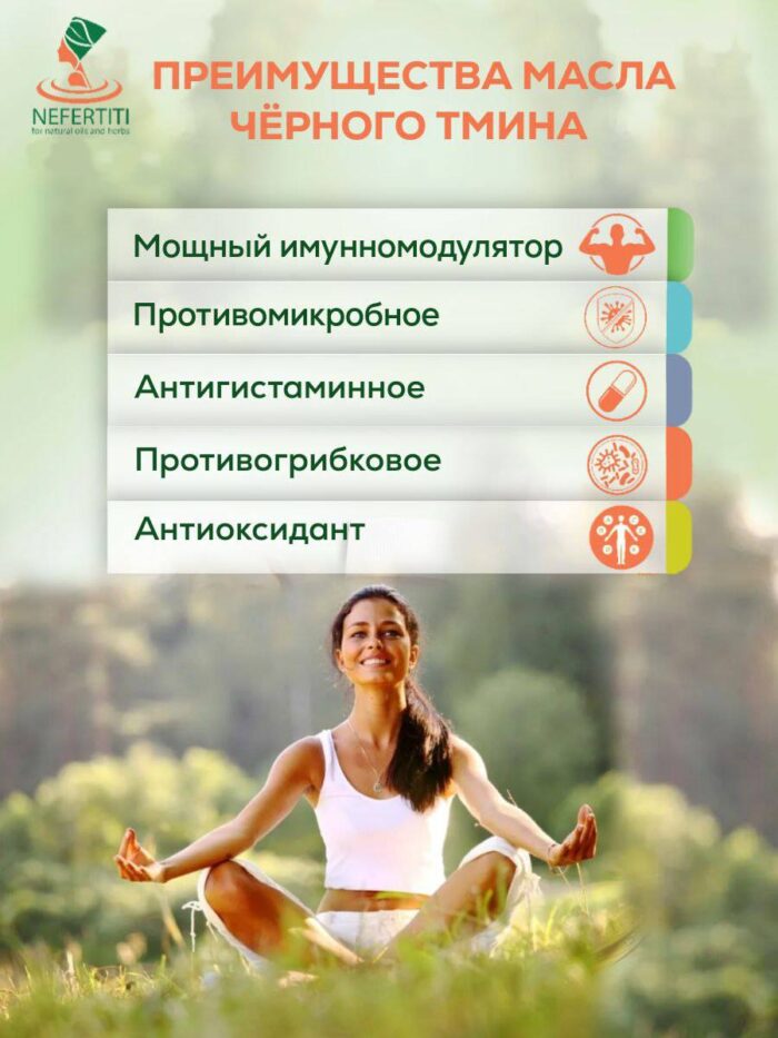 Многочисленные научные исследования доказали способность натурального масла черного тмина полностью очистить организм от вредных веществ, оставшихся в организме после процесса пищеварения, а также защитить от неблагоприятного влияния окружающей среды. Воздействие этого продукта холодного отжима достигается за счет увеличения числа клеток Т- киллеров (NKT). Ученые сравнивают силу действия масла черного тмина с 5 самыми сильными антибиотиками, но в отличие от антибиотиков, оно не имеет побочных эффектов на организм в целом.