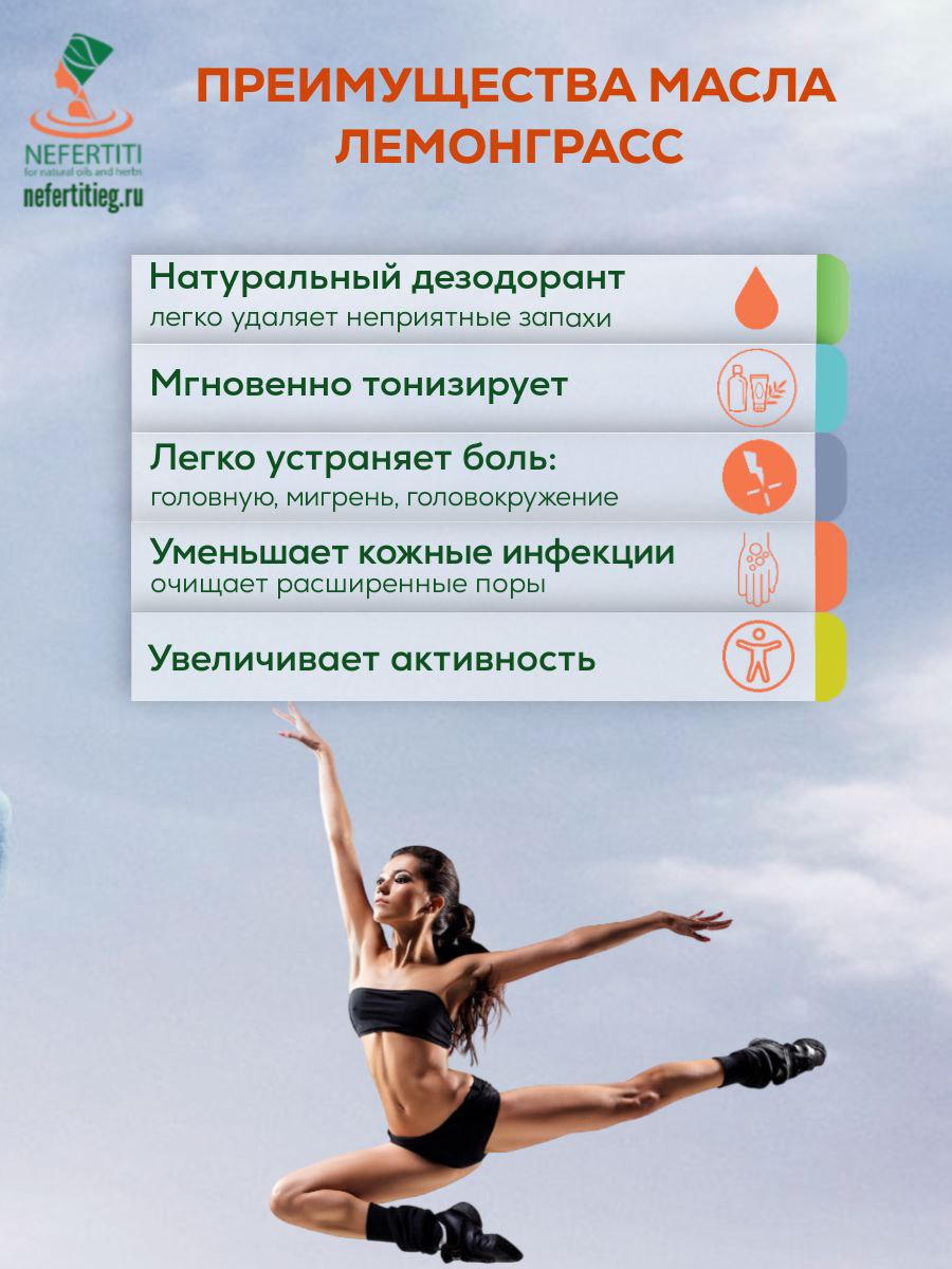 Эфирное масло лимонной травы (лемонграсс) мгновенно тонизирует нервную систему и оказывает положительное влияние на кровообращение и обмен веществ. Масло лимонной травы помогает при терапии различных состояний органов дыхания и широко используется в комплексной терапии вирусных и простудных заболеваний. Натуральное масло лимонной травы эффективно при лечении простуды, синусовых инфекциях, и других респираторных заболеваниях. Эфирное масло лимонной травы легко устраняет головную боль и мигрень, и оказывает положительное влияние на гипотензию, головокружение и чувство усталости.