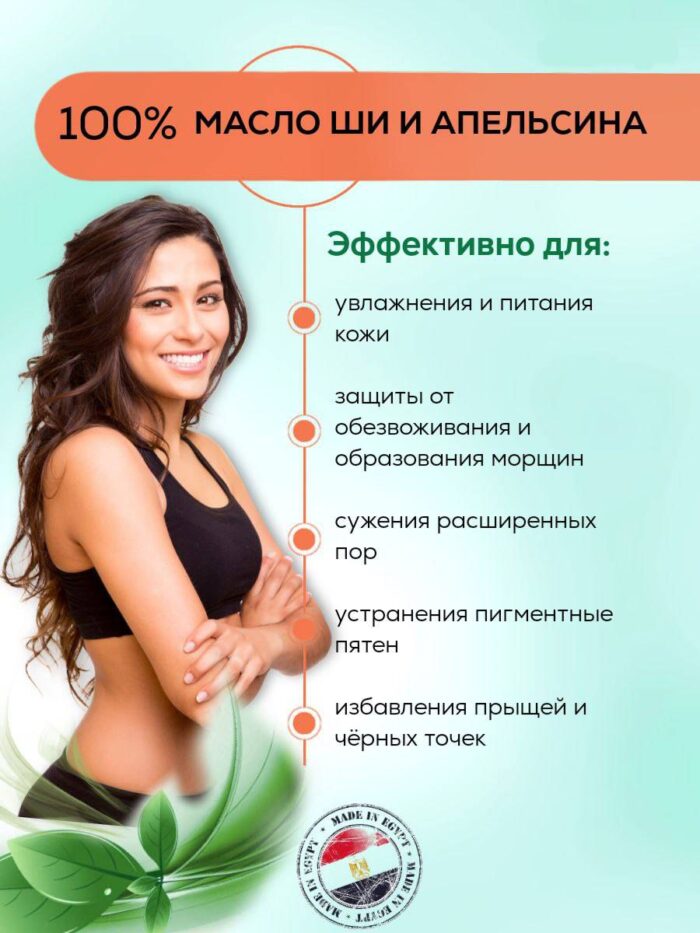 Благодаря антибактериальному эффекту апельсинового масла, апельсиновое масло ши одновременно ухаживает за кожей, и избавляет от прыщей и черных точек.
