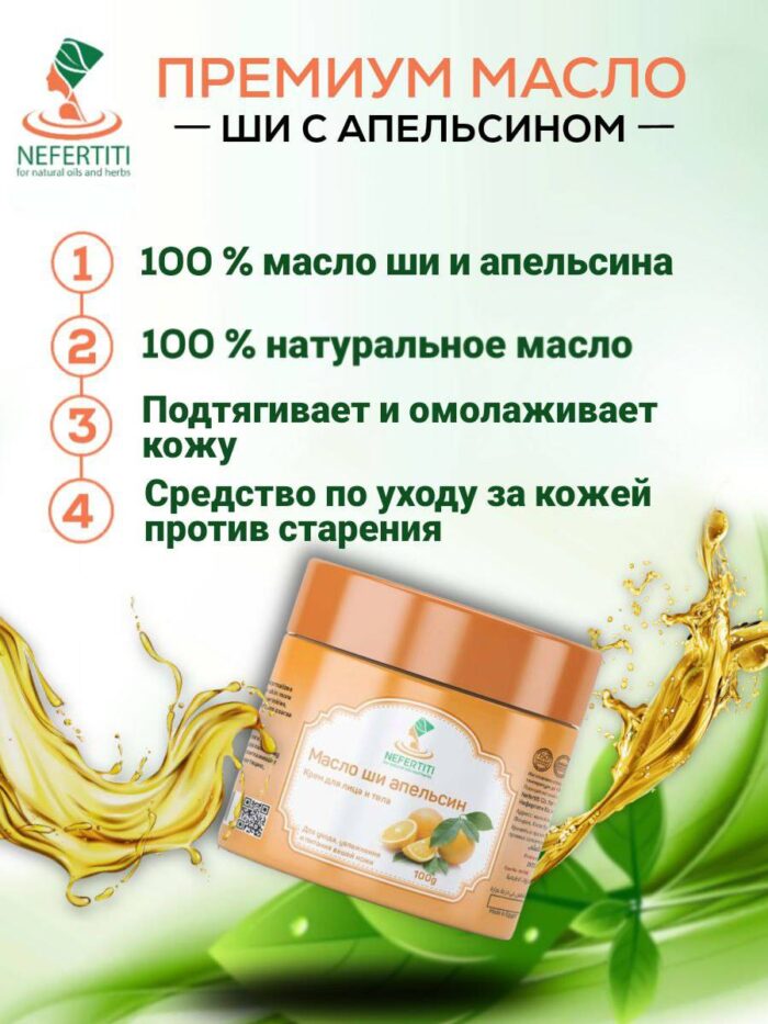 Эти свойства апельсинового масла используются для обогащения масла ши. Не используйте апельсиновое масло в чистом виде, оно подходит для косметики, особенно для обогащения кремов, шампуней, лосьонов и, в данном случае, для нашего масла ши Нефертити.