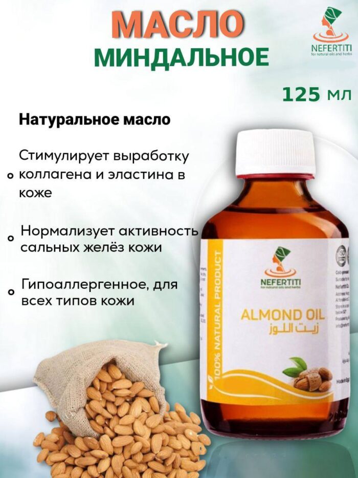 Миндальное масло очень универсально: проникает в кожу очень легко, подходит практически любой коже и любому возрасту, но особенно его рекомендуют использовать для зрелой, сухой, дряблой кожи. Миндальное масло богато витамином молодости – Е, и помимо ряда других полезных минералов и витаминов, оно содержит мононенасыщенные жирные кислоты, что объясняет важность использования миндального масла для нашей кожи. Проникая в глубокие слои кожи, натуральное миндальное масло питает кожу и стимулирует обновление клеток кожи. Не менее важна способность натурального миндального масла стимулировать естественную выработку коллагена и эластина в коже человека. Природное масло миндаля может уменьшить и даже удалить воспаление кожи. Одним из сильнейших ингредиентов для красоты, содержащихся в натуральном миндальном масле, является витамин F, который предотвращает появление увеличенных пор и нормализует активность сальных желез кожи. Миндальное масло обладает легкой текстурой и не вызывает отечности, поэтому его можно наносить даже на нежную кожу век, чтобы разгладить мелкие морщинки вокруг глаз. Ваше тело преобразится, если делать массаж с миндальным маслом: кожа станет более ровной, упругой, вернется эластичность и исчезнут бугорки. Чистое миндальное масло идеально подходит для ухода за кожей детей и новорожденных.