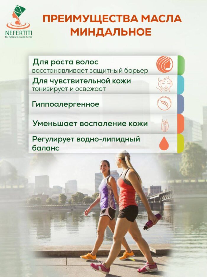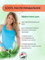 Натуральное миндальное масло – это шелковистое, мягкое, гипоаллергенное и нежное масло, которое можно безопасно использовать для всех типов кожи, в том числе даже для чувствительной детской кожи. При мягком втирании в кожу миндальное масло прекрасно впитывается. Натуральное миндальное масло имеет легкий ореховый запах, который большинство людей находят приятным и расслабляющим, поэтому эфирное масло миндаля именуют одним из лучших базовых масел для массажа. Оно восстанавливает естественную защитную пленку кожи, насыщает ее витаминами, прекрасно увлажняет обезвоженную сухую кожу тела. Природное масло миндаля можно использовать в качестве основного массажного масла, а также вы можете использовать его для обогащения большинства ваших косметических продуктов, начиная с крема и лосьона для лица и тела, и заканчивая средствами по уходу за волосами. Миндальное масло может быть использовано для уменьшения воздействия ультрафиолетовых лучей на кожу, что позволяет уменьшить последствия “фотостарения” кожи. Витамины и минералы, содержащиеся в миндальном масле, укрепляют ломкие ногти, позволяют расти им быстрее, быть сильными и здоровыми. Миндальное масло ценят за способность замедлить процесс старения кожи, повысить ее эластичность, вернуть блеск волосам и ускорить их рост. Масло можно использовать для снятия макияжа. Это одновременно питает ресницы и брови и стимулирует их рост.