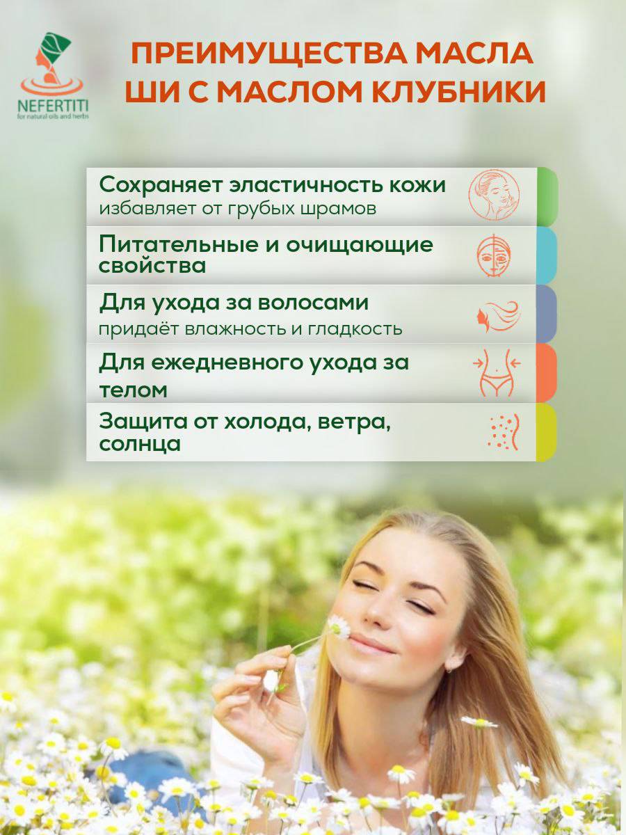 Защитная функция масла ши с клубничным маслом обеспечивает коже естественный барьер против воздействия бактерий и вредных факторов окружающей среды. Мощные увлажняющие свойства делают его антивозрастным продуктом, так как с возрастом кожа активнее теряет влагу и эластичность, и регулярное использование масла ши с клубничным маслом поможет предотвратить это. Клубничное масло обеспечивает коже необходимое увлажнение. Эта смесь эффективна при таких кожных заболеваниях, как акне, псориаз, экзема и дерматит, а также при повреждениях кожи от солнечных ожогов. Восстанавливая эластичность кожи, масло ши с клубничным маслом помогает при растяжках и шрамах. Для использования возьмите немного масла ши с клубничным маслом в ладони, разотрите, а затем нанесите его на кожу.