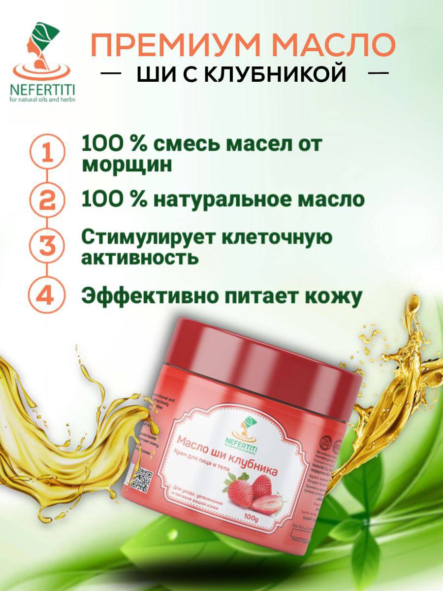 При покупке натуральных продуктов всегда обращайте внимание на качество. Масло ши с клубничным маслом Nefertiti производится под постоянным контролем качества на собственном заводе в Файюме из 100% натуральных продуктов, без использования искусственных добавок. Мы контролируем выращивание растений, собственное производство натуральных продуктов, весь процесс, вплоть до продажи в наших магазинах или интернет-магазинах. Доверьтесь маслу ши с клубничным маслом от Nefertiti For Natural Oils & Herbs: наше высшее качество!