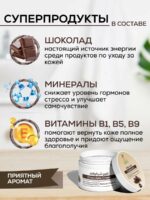 Содержит витамины B1, B2, B3, B5, B9 и E, необходимые минералы, включая магний, кальций, серу, цинк, железо, медь, калий, плюс бета-каротин, жирные кислоты омега-6 и полифенолы, называемые флавоноидами (с потрясающими антиоксидантными свойствами. ), шоколад – это не только суперпродукт для тела, но и для кожи.