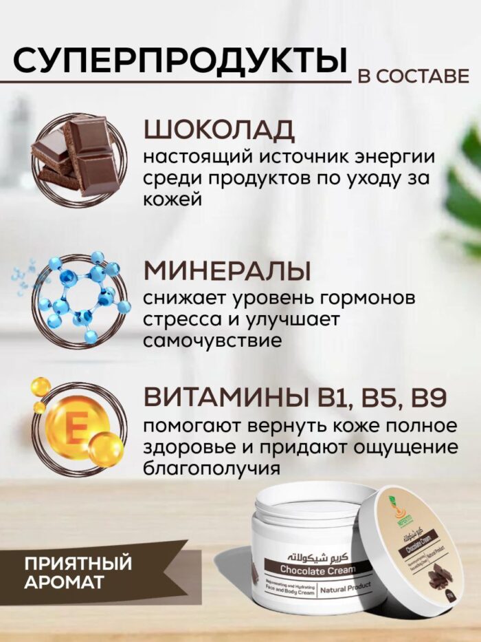 Особенно хорошо подходит для сухой кожи, используйте шоколадный крем с его нежными ингредиентами, которые помогут вернуть коже полное здоровье.